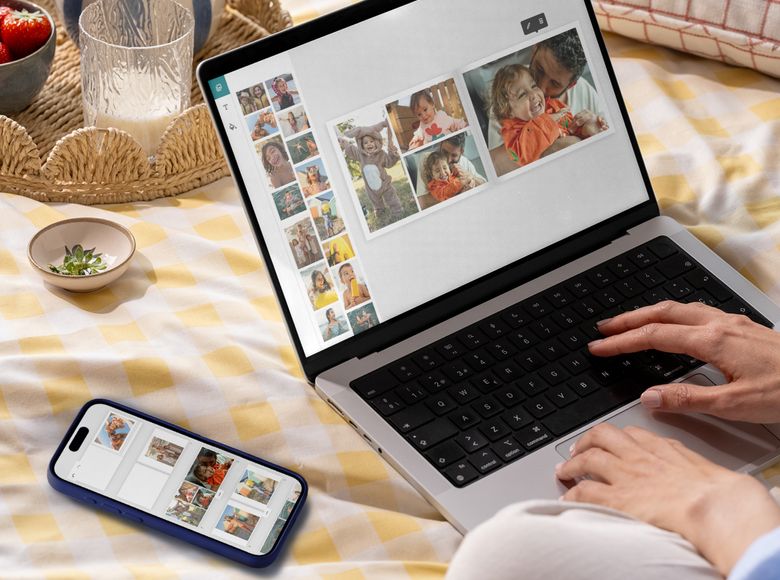 Reúna todas as suas fotos num único local, prontas para a sua próxima criação. Carregue-as para “As Minhas Fotografias” a partir do seu telemóvel, portátil ou Google Fotos, organize-as em álbuns e elas serão sincronizadas entre a aplicação e a Web (exceto a nossa aplicação para edição em computador).