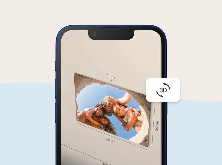 Veja a sua arte mural ganhar vida em 3D e fique com uma ideia do tamanho, espessura e acabamentos da moldura.