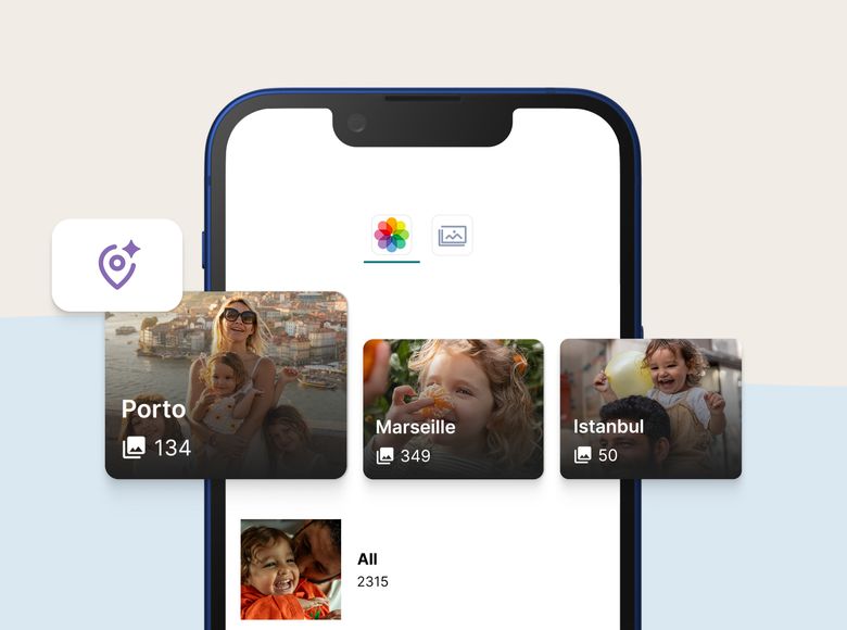 Esqueça o scroll. A nossa ferramenta encontra automaticamente fotos das suas viagens recentes na galeria do telemóvel e transforma-as em álbuns prontos a usar para o seu livro.