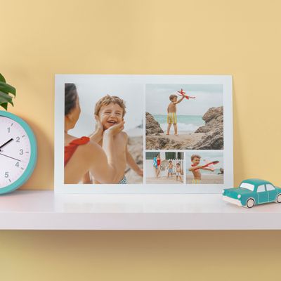 Relembre os seus melhores momentos com uma colagem de fotos em acrílico. O material acrílico ajuda a ampliar as cores, a profundidade e os pormenores das fotografias. A impressão é feita no verso de uma folha de acrílico de 4 mm e selada com uma película preta, permitindo-lhe desfrutar de um acabamento polido e brilhante nas suas fotografias.